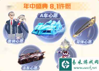 年中盛典许愿活动介绍【活动介绍】 8月1日-8月15日,年中盛典许愿活动限时开启。 8月1日开始许愿有机会获得S-追光者、冰皇、火神和赛博战士等A车,车手们别错过咯~ (1)本次心愿活动分为A车许愿和必得许愿两个奖池。 (2)A车许愿中,将会提供12辆A车供车手们进行选择,活动开启后登录游戏即可进行许愿。 (3)必得许愿包含套装、B车、宠物、背饰奖励。累登1天则开启1个许愿,累登4天开启第4个许愿;当许满4个心愿时,则必然获得2个永久奖励! (4)注意,必得许愿中,宠物心愿若没有获得永久,则会获得宠物能量奖励,其他许愿若没有获得永久则会获得期限奖励。 (5)未许满四个愿望的车手,在开奖时间之后依然可以许愿,许满再领奖。