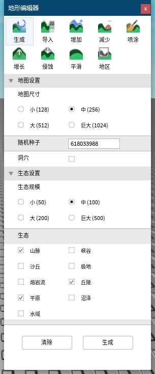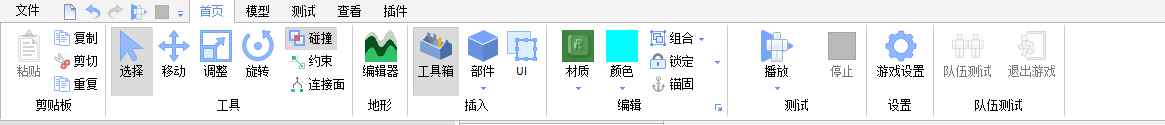 剪切板:剪切板中包含粘贴(Ctrl+V)、复制(Ctrl+C)、剪切(Ctrl+X)、重复(Ctrl+D)4个命令,只说一下最后的一个“重复”,重复是"原地复制粘贴"的意思,另外这4个命令除了“粘贴”以外,其他都需要选中零件才能使用, 工具: 选择(Ctrl+1):仅用于选择零件,按住鼠标左键可以拖拽零件 移动(Ctrl+2):显示零件的X(红)、Y(绿)、Z(蓝)轴,拖拽轴可在单轴上移动零件 调整(Ctrl+3):缩放零件,拖拽X(红)、Y(绿)、Z(蓝)轴方向的球,可以单反向缩放,按住Shift拖拽可以等比例缩放,按住Ctrl可以双向缩放 旋转(Ctrl+4):旋转零件,拖拽X(红)、Y(绿)、Z(蓝)轴方向的球可以 以每次45°旋转零件,默认一次旋转45°,如果需要其他角度,请到“属性”的“Orientation”选项进行修改 碰撞:设置零件在移动、旋转、缩放的时候,是否进行碰撞判断,如果开启,移动、旋转、缩放的零件无法穿过其他零件,会发生碰撞,如果关闭,则可以直接传过去 约束:开启或关闭约束功能,开启时,在移动、旋转、缩放零件的时候碰撞到零件的话,同时会将碰撞到的零件移开 加入、总是、仅表面、从不:这一项的具体功能我暂且还没研究明白,故就不在此说明了 地形:点击“编辑器”会打开“地形编辑器”,地形编辑器中共有9个子功能: 生成:设置地形的基本属性,随机生成一个地形,根据电脑配置不同,生成的速度也不同 导入:导入一张地图,具体使用方法不明,有待研究 增加:添加地形,可以设置笔刷的大小、强度、形状,材质直接决定刷出来的是什么,需要注意的一点是,这玩意粉刷的位置与我们和地面的斜角有关,背部的网格就是纵向粉刷位置的平面(有点难解释,大家去试一下就懂了) 减少:即删除地形,可以将当前已经创建或添加的地形删除,需要注意的是,如果要删除水的话,需要将“忽略水域”旁边的勾去掉,另外就是,这个只会删除地形,不会删除道具 喷涂:改变已添加的地形的材质,一样,如果需要修改水的话,需要将“忽略水域”旁边的勾去掉 增长:在当前地形的基础上,增加额外的地形,与“增加”不同的是,“增长”需要有基础的地形 侵蚀:与“增长”相反,以融化的形式移除地形 平滑:对地形进行平滑,将尖锐的棱角变动平缓 地区:可以选择、移动、缩放、旋转、复制、粘贴、删除、填充地形,使用方法类似“工具”中对应的功能