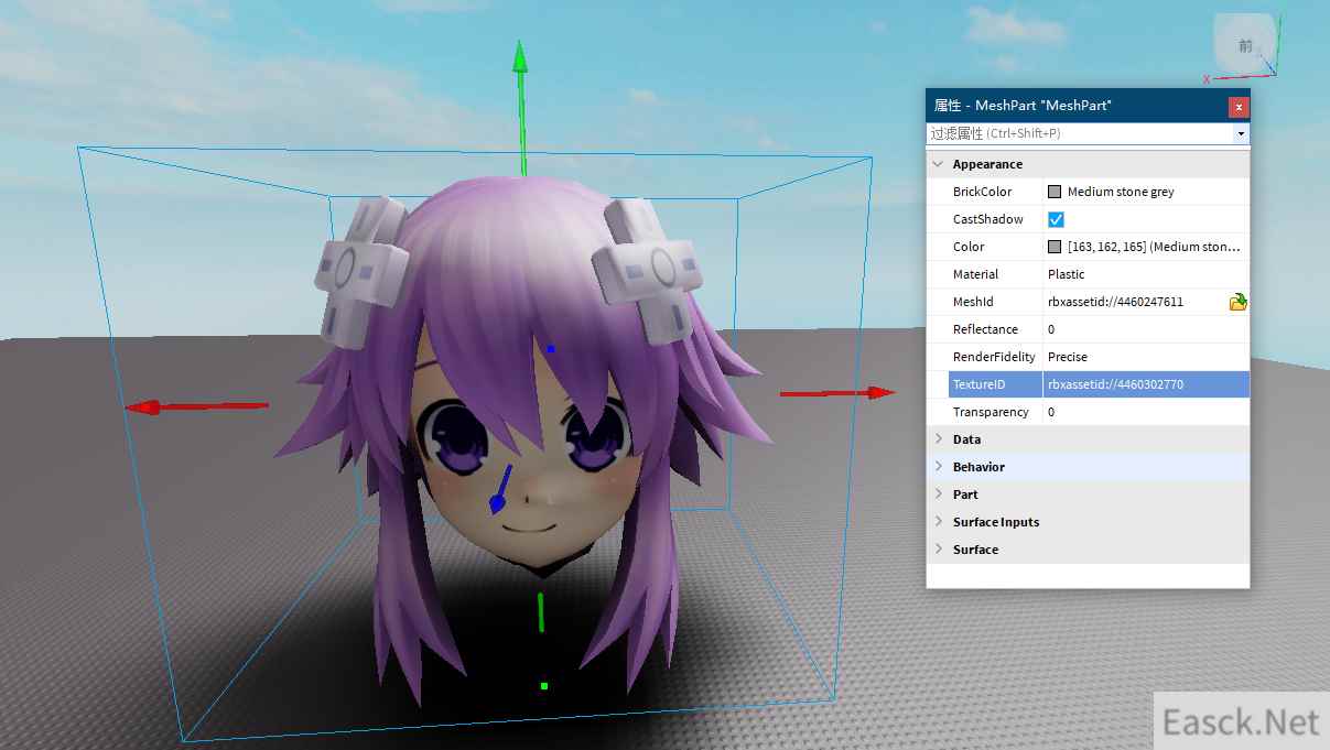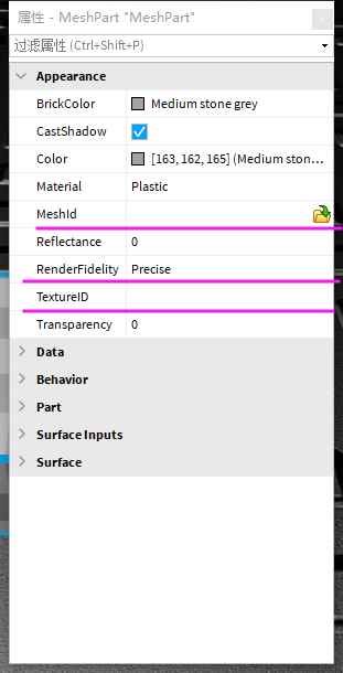 “MeshPart”的属性和“Part”的属性非常相似,多余的这里就不讲解了,我们来看到“MeshPart”多出来的3个选项 Meshld(模型ID):点击右边的按钮可以导入模型,支持fbx和obj,这两种格式均可在3DsMax中保存出来(当然,不仅限于3DsMax) RenderFidepty(渲染质量):修改导入进来的模型的质量,有Precise(精确)和Automatic(自动)两个选项,用于设置导入进来的模型的质量 TexturelD(纹理ID):贴图的ID,这里需要说一下,如果想添加贴图,得先把当前游戏进行发布,否则这里是空的