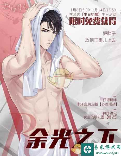 *获得羁绊 即可获得李泽言的朋友圈 心理活动 *羁绊进化 即可获得女主的朋友圈 睡衣 活动时间 2019年1月8日更新后~1月14日23:59 全地图生日材料掉落 为他手制赠礼 1、活动期间,主线全地图普通、精英关卡将额外掉落礼物制作材料【幸运水晶】、【包装礼盒】、【生日贺卡】。 2、在生日活动页面,可以消耗钻石或心意礼券,将这三种材料制作成生日礼物并送给李泽言,增加【心意值】。 3、心意值达指定档位,即可领取生日特别R【李泽言·余光之下】、生日特别SR【李泽言·生日初晨】等奖励! *制作生日礼物时,三种材料不同的数量搭配会制作出的不同种类和数量的礼物。 收到不同礼物的他,会有怎样的反应呢? 以上就是小编整理的恋与制作人李泽言余光之下卡片的获取方法,想知道更多相关攻略的请关注手游网。 |