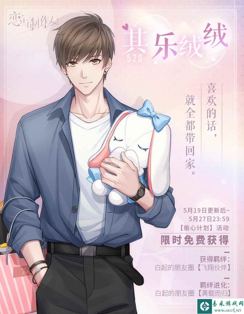 《恋与制作人》白起其乐绒绒介绍这天的所有计划,都想和你一起。 恋与制作人超话 偷心计划:累计登录领取520纪念R羁绊 累计登录,520纪念R免费任选 1.5月19日更新后~5月27日23:59,可从【精彩活动】-【偷心计划】页签进入累计登录活动。 2.累计登录达指定天数,即可领取升华材料和金币奖励。 3.累计登录满5天,即可在【周棋洛·二分之一】、【白起·其乐绒绒】、【许墨·甜心路线】、【李泽言·限定套餐】、【凌肖·享乐主义】五张纪念R羁绊中,任选一张免费领取。 票房奖章限时兑换 5月19日更新后~5月27日23:59,五张520纪念R羁绊上架【票房争夺战】兑换商店,使用票房奖章即可兑换【R羁绊碎片*5】,每张羁绊每天限兑一次。