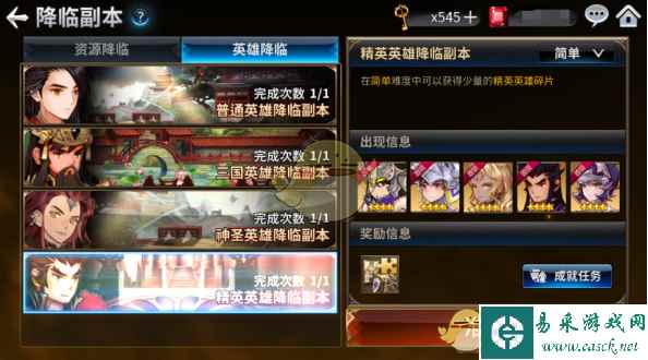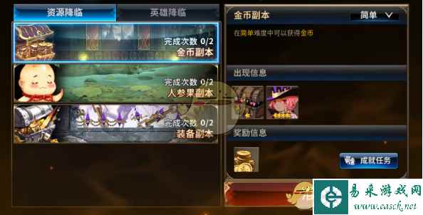 《十二战纪》中和降临副本可以说是很多小伙伴都要一直打的地方了,对于很多玩家都要很长时间奋斗在关卡事业中。下面就来看看降临副本的详细情况吧。 降临副本 通过主界面→战斗,进入降临副本,降临副本分为资源降临和英雄降临。 玩家等级达到9级以上才可以进入。 资源降临的每个副本每天可以进入2次,分为金币副本、人参果副本、装备副本。 获得奖励分别为金币、人参果、装备。 英雄降临的每个副本每天可以进入1次,分为普通英雄降临副本、三国英雄降临副本、神圣英雄降临副本、精英英雄降临副本。分别可以获得奖励为普通英雄碎片,三国英雄碎片,神圣英雄碎片和精英英雄碎片。