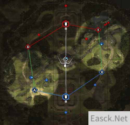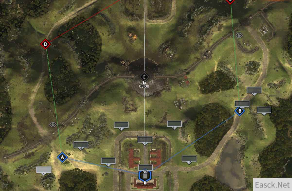 在全面战争竞技场中,哈德良长城横贯整张地图,斜向把整张地图分为两个部分。长城上共有5个缺口,这5个缺口也是仅有的5条通道。中路大点为最大的缺口,C点的左右两侧各有两个小缺口。两条边路线则分为进攻线和防御线,缺口离我方据点较近的为防御线,两个视野点均在离缺口远的一方一侧,简单地说就是进攻方可以更加轻易的占据视野点。在哈德良长城这张地图上,哪一方率先攻破缺口,哪一方就能获得极大优势。