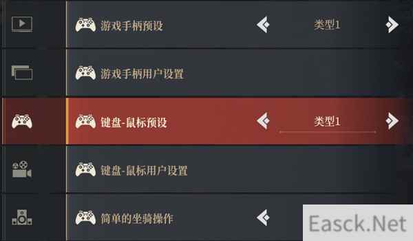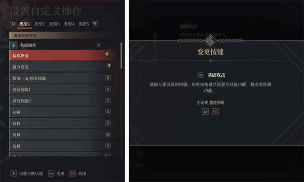 ◼ 自定义操作 请按照以下步骤来自定义控件。 打开菜单>系统菜单(F)>选择>设置自定义操作>键盘-鼠标用户设置 (手柄用户, 请点 【游戏手柄用户设置】) 从菜单顶部选择要自定义的预设(类型1~5)。 选择要更改的选项,然后按 【空格】键。 当弹出信息出现时,按您要用于该选项的键/按钮。 (【Enter】键和【Esc】键不能用于自定义)