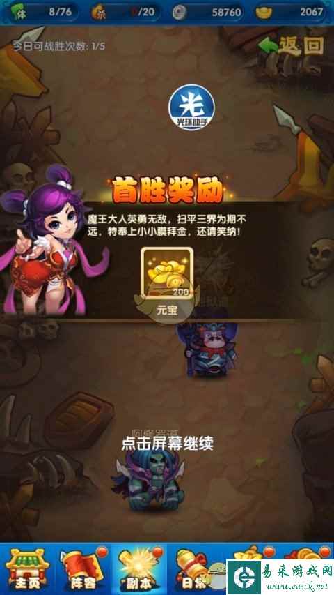 终于可以开启精英关卡了,每日可以挑战5次,首次都可以拿到200元宝。在这里我们可以一次性拿到1000元宝。这个时候我们的战力可以去尝试打竞技场,超过了一定的名次还可以拿元宝。