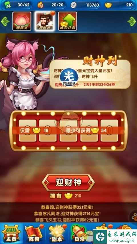 我们可以在成长计划里面領取元宝。然后我们再在财神到这里迎接一下财神,我们马上就可以拥有超过300元宝进行第一次首抽。