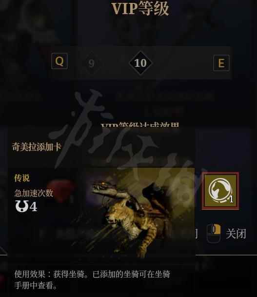 vip10坐骑为奇美拉。 当玩家达到vip等级10的时候,就可以领取一张奇美拉添加卡,获得一只传说等级的奇美拉坐骑。 vip10坐骑展示