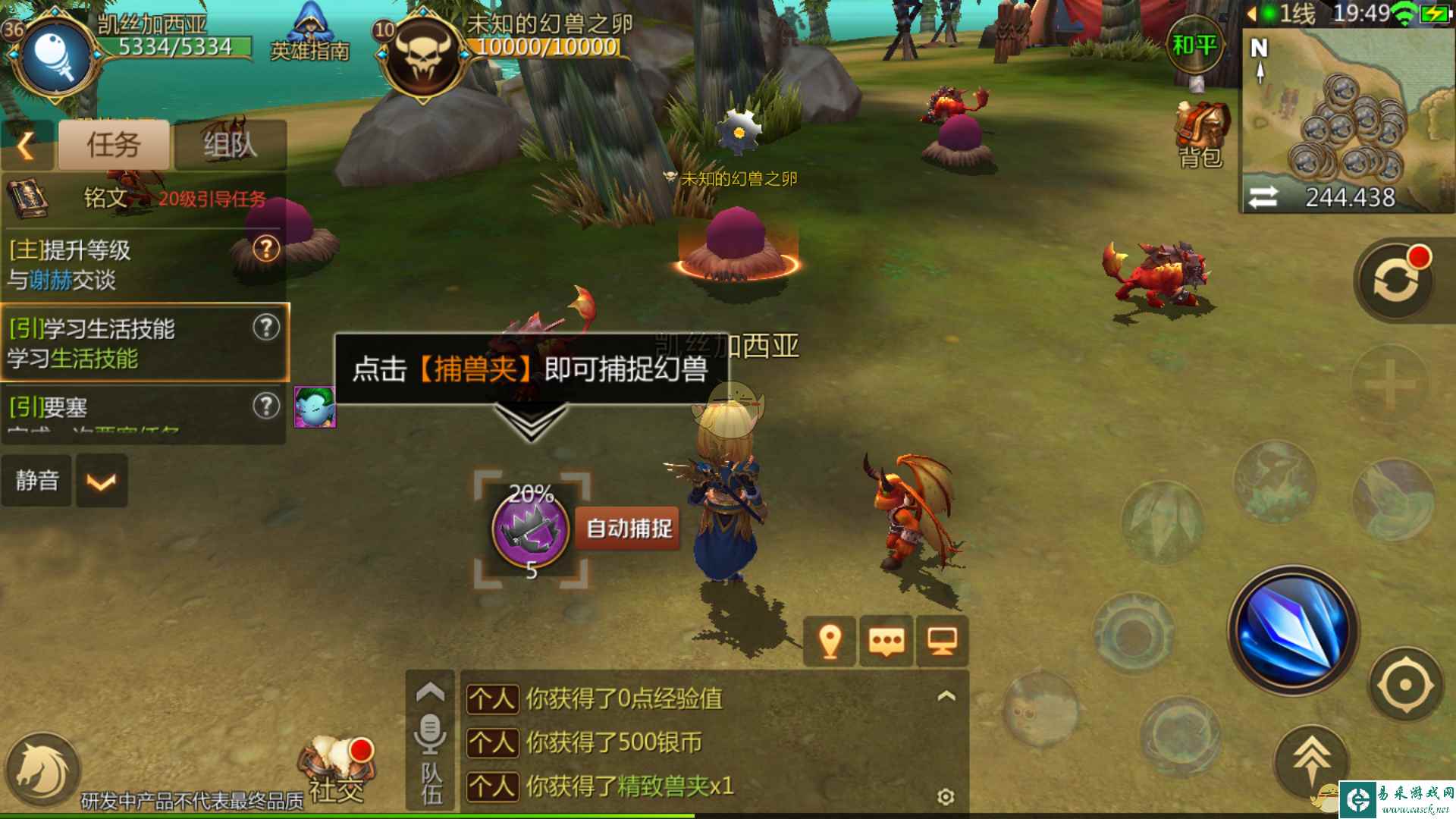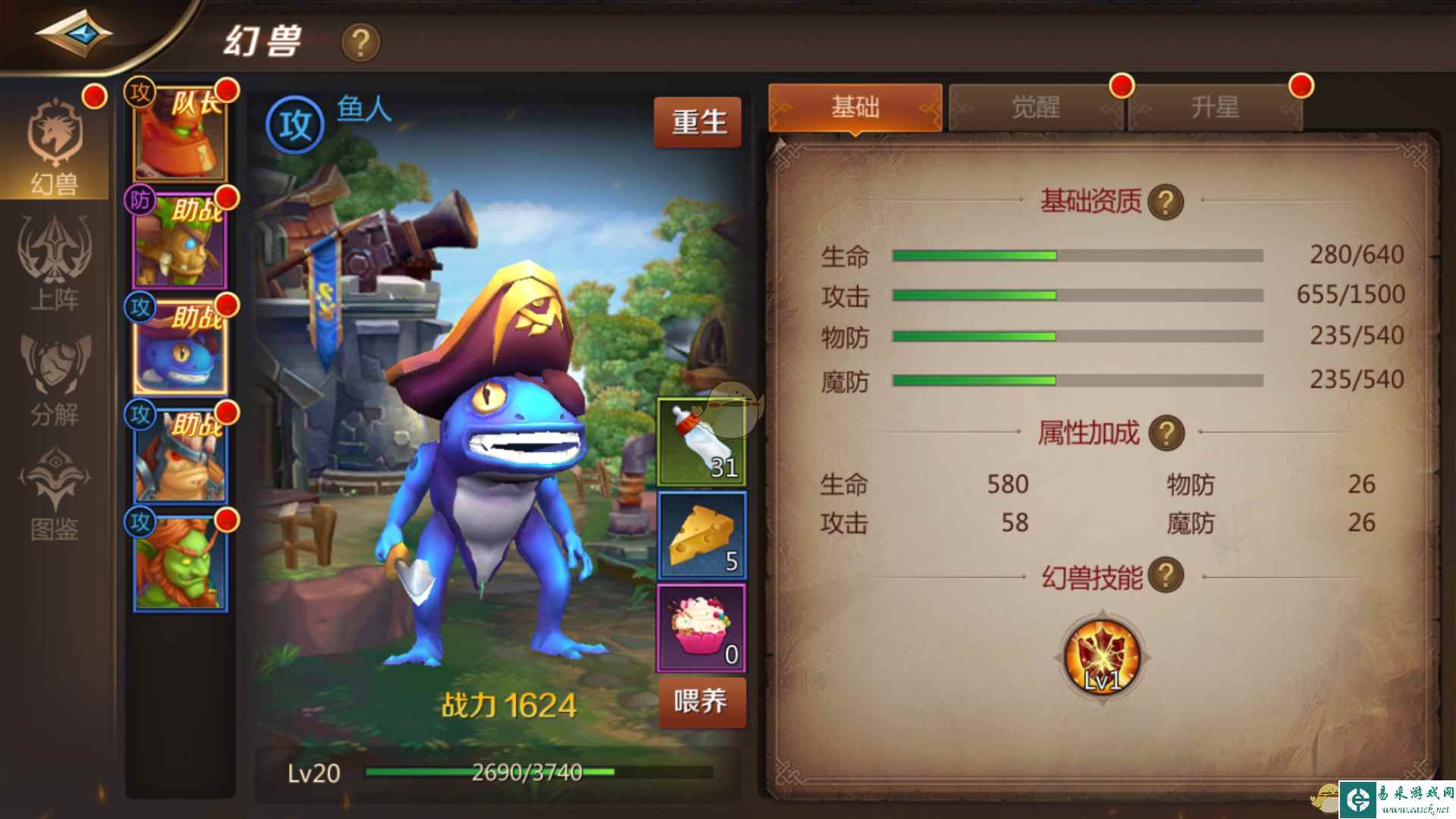 幻兽的初始等级为1级,可以给幻兽喂食物进行升级,每提升一级可提升幻兽基础属性,但是幻兽等级不可以超过主角等级。幻兽升级所需的食物材料主要来自于游戏内的要塞玩法,捕捉幻兽以及分解幻兽。