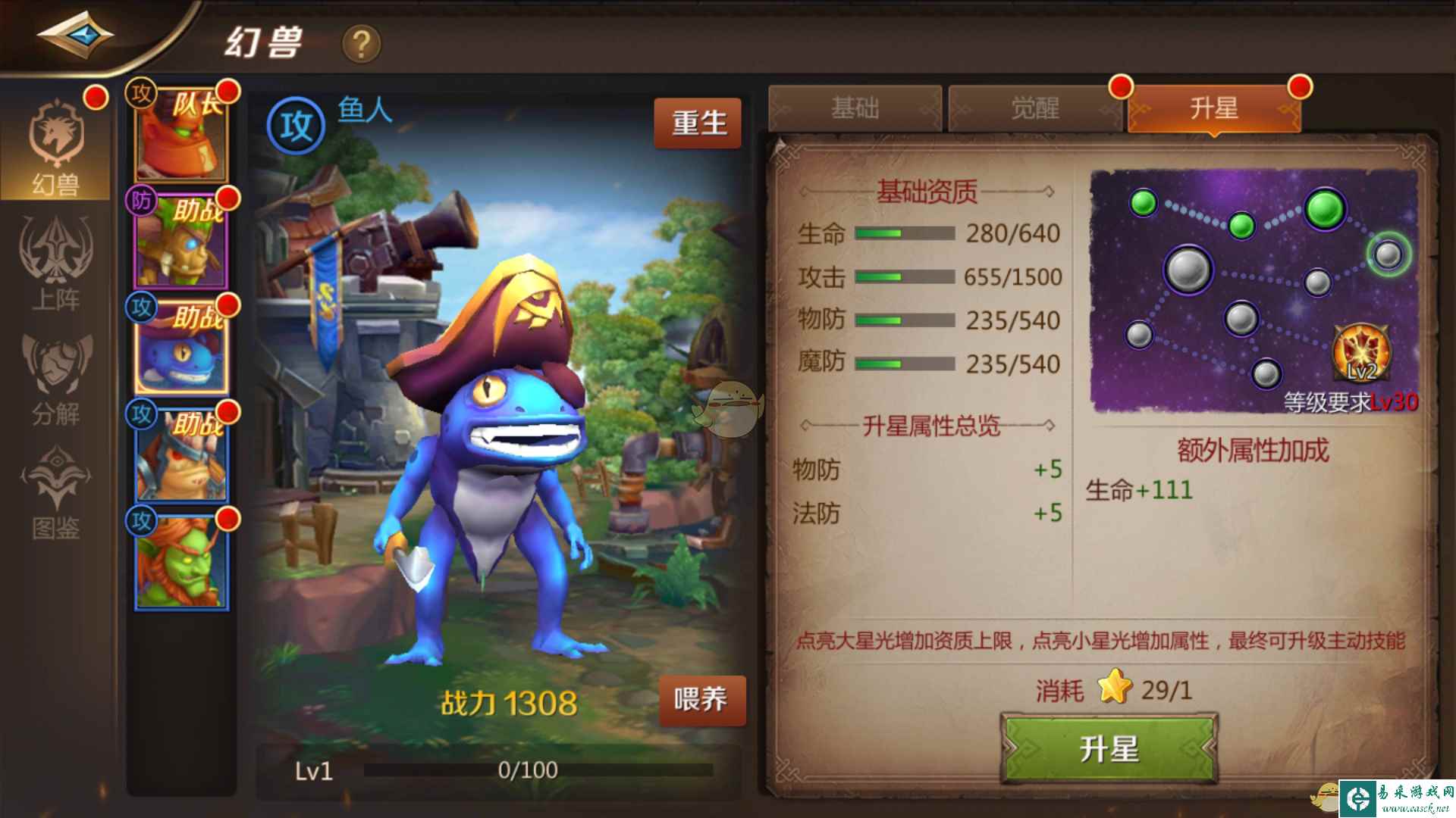 幻兽初始星级为0星,可以消耗道具材料进行升星,最高5星。幻兽升星受等级限制,升星过程中点亮星图,当个星图全部点亮后且达到升星等级时,可自动升1星,幻兽升级后各项基础属性会得到提升。