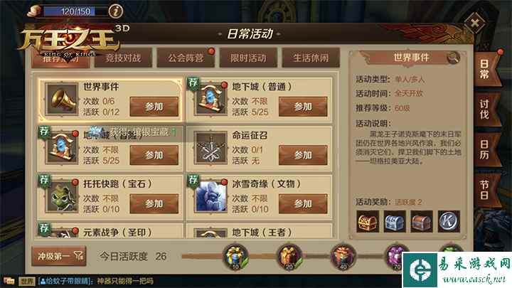 在《万王之王3D》手游中,有着许多的副本和活动。有的是单人参加,有的却是需要玩家组队参加,每一个活动都有它独特的魅力。今天要为大家介绍的便是这众多活动中比较偏娱乐而且好玩儿的——世界事件。那么世界事件究竟是什么样的活动呢?下面就为大家详细介绍一下吧!