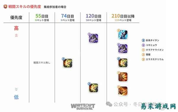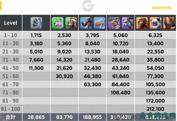 无尽冬日中的宠物可以帮助玩家提升玩家的建造速度、采集速度等等的事项,是非常重要的存在。宠物的等级越高意味着更高的加成,那么宠物升级究竟要消耗什么材料呢?这里小编为各位带来了无尽冬日宠物升级消耗一览的名单,希望对你有帮助。 一、宠物解锁时间 宠物的解锁是随着服务器进度逐步开放的,每一代宠物的解锁时间如下: 第一代宠物:服务器开服55天后解锁 第二代宠物:服务器开服91天后解锁 第三代宠物:服务器开服143天后解锁 第四代宠物:服务器开服200天后解锁 第五代宠物:服务器开服280天后解锁 这些宠物的解锁时间逐渐推后,玩家可以根据时间的推移解锁更多高品质的宠物。 二、宠物培养推荐 初期培养: 冲等级:宠物在早期的培养优先提高等级,提升其基本属性。 洗练:使用蓝色洗练石或金色洗练石提升宠物的属性,微氪或非氪玩家可主要使用蓝色洗练石。 宠物材料获取:缺少宠物材料时可以通过常规活动、宠物礼包或月卡获取。 宠物培养优先推荐: 第一代:御三家宠物优先提升等级,并解锁其技能,特别是提升城镇建设速度和采集速度。 第二代:建议优先培养巨貘,提升至满级,这样可以确保有足够的口粮储备。大鸟则优先提升等级,因为它能提供降低敌方生命力的Buff。 第三代:强度党建议优先培养雪豹,其他微氪玩家可以跳过这一代,雪豹的技能效果比前两代更为强大。 第四代:此时是SSR宠物登场,所有宠物都是必练的,特别是在活动和联盟战中非常有用。推荐优先培养雪猿,雪猿的技能可以提升部队数量至15000。 第五代:第五代的SSR宠物是必练的,尤其是车头玩家,建议两只都要培养到满级,以便在后期的战斗中取得优势。 三、宠物升级顺序 宠物的技能可以分为战斗类技能和生产类技能。根据这些技能的作用,玩家可以优先培养不同类型的宠物。 战斗类宠物优先顺序: 74天:泰坦大鸟 120天:雪豹 210天:雪猿 战斗类宠物的优先级较高,尤其是泰坦大鸟和雪豹,它们在参与集结战斗时会提供极大的帮助。雪猿则在后期的战斗中尤为重要。 生产类宠物优先顺序: 长期使用:洞斑猎犬 后期使用:麝牛、北极狼 生产类宠物主要用于提升资源生产速度,洞斑猎犬在早期至后期都非常实用,而麝牛和北极狼则在后期也有较大的提升作用。 四、每个宠物需要培养的经验以及材料 以上就是无尽冬日宠物升级消耗一览的全部内容,希望对你有帮助。想查找更多游戏攻略,欢迎持续关注查看。 |