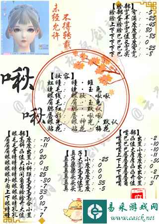 >>云裳羽衣捏脸数据大全<< 【捏脸】 眼部 眉毛高度:-70 眉毛倾斜:-11 眉骨突出:0 眼睛位置:20 眼睛大小:0 眼睛倾斜:-15 眼睛间距:25 外眼角高:-30 内眼角高:-7 上眼脸高:33 下眼睑高:0 眼睛开合:10 瞳孔大小:-7 瞳孔位置:7 鼻子 鼻子大小:-25 鼻梁宽度:0 鼻梁高度:0 鼻头高度:0 鼻头位置:35 鼻头宽度:-5 嘴部 嘴巴突出:-2 嘴巴位置:-10 嘴巴大小:-10 上唇厚度:-11 下唇厚度:-50 上唇凸出:0 下唇凸出:-2 嘴唇开合:-17 嘴角位置:3 脸部 脸部宽窄:-5 脸蛋丰满:-25 上脸宽度:-45 下脸宽度:80 下巴位置:-85 下巴长度:0 下巴宽窄:-25 下巴尖宽:-8