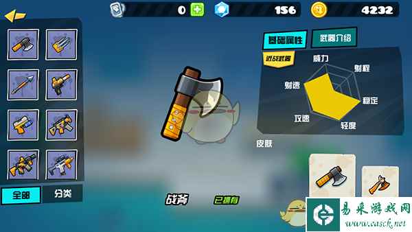 阿卡47在破坏力上没有霰弹枪和飞镖枪强,不过阿卡47强势的地方在于正面交火能力非常强。持续高速的火力压制对攻速较慢的枪械是致命的,在边打边退或者边追上灵活性也比霰弹枪系列要强的多,特别是喵喵侠高机动性让冲锋枪的特点发挥的淋漓尽致。 比起相对需要近身才有理想输出的霰弹枪,阿卡47无疑更加无脑和适用于新人玩家。 副武器 1、战斧