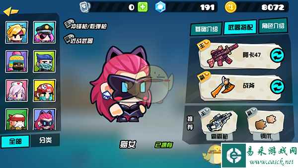 主武器用作为冲锋枪的阿卡47是对于刚上手的小伙伴第一选择了,稳定而均衡的属性,简单直接的射击操作,对着敌人一个劲的密集火力扫射就好。有着喵喵侠的高速被动,就算被反攻,也可以快速逃离战场。而且阿卡47虽然子弹打的快,但是换弹时间也非常快,对于高机动性的喵喵侠换个弹再跑出扫射,空档期极小,副武器用的机会不多。 没什么难度的操作,也等于不会有太多失误,唯一注意的就是不要太独,多和队友组队前进。 2、方案二(主:霰弹枪/飞镖枪、副:战斧)