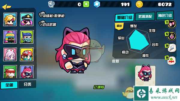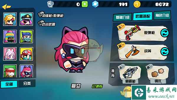 喵喵侠是一个非常灵活的角色,在有着高机动性的同时兼顾着强大的爆发能力。她的主动技能移形换影可以和敌人或者队友互换位置,这个技能效果让喵喵侠在不管什么困境都有一定的反制能力,也可以拯救队友和追杀留人。投掷技能的虚弱药剂则是喵喵侠的爆发手段了,虽然技能本身没有伤害,不过主要击中对方,对方受到的所有伤害就会翻倍。或许已经有小伙伴注意到了,不止是喵喵侠的攻击,队友打出的伤害自然也是翻倍的。这可比暴击和伤害提升要强多了,不过因为CD和虚弱弹的范围,有着一定的局限性。 喵喵侠的被动方面是移动加成和吸血上(这真的不是蝙蝠女吗?),移动自然不用提,速度提上来,不管做什么都得心应手。吸血是全游戏喵喵侠才有的被动技能,有着续航的效果,点低了效果少,点高了确实吸血很快,不过也等于放弃了高速的被动,看个人取舍了。 在初步了解喵喵侠的技能和特点后,我们就先对喵喵侠目前主流使用的主副武器进行相性分析和介绍,之后在给出搭配方案。 主武器 1、飞镖枪/霰弹枪