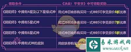 专属联动皮肤雪女·霜雪连莲 >>>点击查看皮肤立绘 阴阳师中达成“非酋·初级”成就 一定数量的祈福纸签 阴阳师中达成“非酋·中级”成就 一定数量的祈福纸签 阴阳师中达成“非酋·高级”成就 一定数量的祈福纸签 阴阳师中达成“非酋·阴阳师”成就 一定数量的祈福纸签和专属月见黑头像框 阴阳师中达成“非酋·大阴阳师”成就 一定数量的祈福绘马 阴阳师中拥有4星及以下星级式神 用式神召唤券购买同一式神时可享受原价8折优惠 阴阳师中拥有5星式神 用式神召唤券购买同一式神时可享受原价7折优惠 阴阳师中拥有6星式神 用式神召唤券购买同一式神时可享受原价5折优惠 阴阳师中拥有式神的皮肤 用皮肤券购买同一皮肤时可享受原价5折优惠