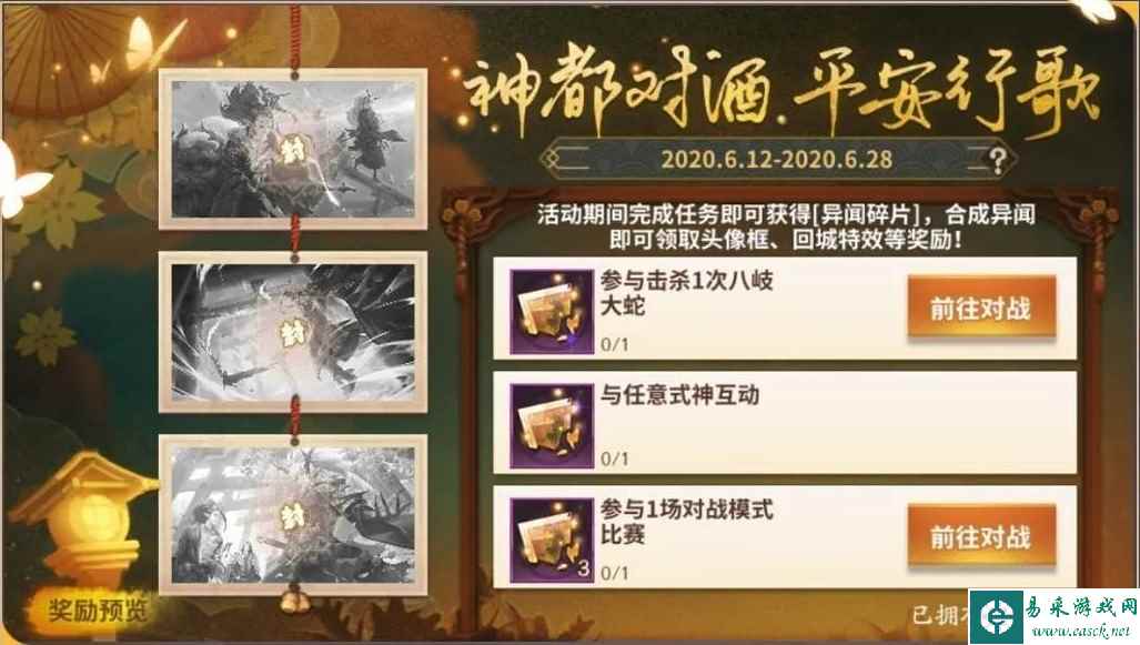 《决战平安京》神都夜行录联动活动攻略决战平安京神都夜行录联动活动攻略 一、活动介绍 茨木童子和酒吞童子从神都的世界中一游盛世大唐携新装归来,听闻还带回了一位客人——来自遥远唐土的大司命,即将降临平安京,这路奇闻轶事且看异闻一一道来。 解开被封印的神秘异闻,探索他们的这段奇妙旅程吧~ 活动时间:6月12日维护后~6月28日 二、活动内容 1.活动期间收集【异闻碎片】以解锁【异闻】,一览游历故事,还可以获取来自神都世界的特别奖励。 2.【异闻】共有3张,大人们需要收集【异闻碎片】依次解锁被封印的异闻,探寻游历故事 3.解锁每一张【异闻】需要20个【异闻碎片】,完成任务即可收集碎片。
