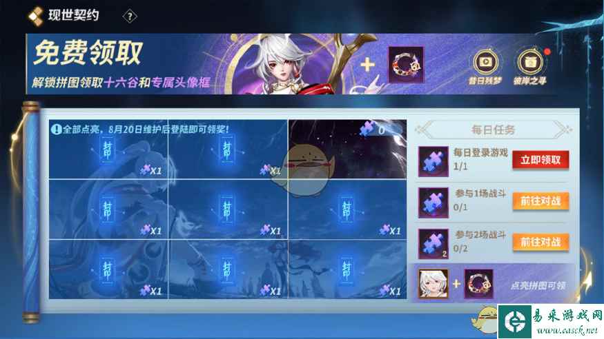 《决战平安京》十六谷免费获取方法现世契约 活动时间: 8月13号维护后-8月20日 活动期间完成任务即可获得[命运残片],解锁整个拼图后可在8月20日维护后免费领取式神[十六谷]。 拼图解锁次数获得方法 每日登录1次,参与1场战斗1次,参与2场战斗2次