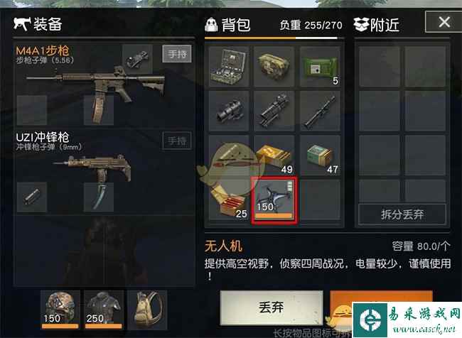1.耐久150:AK的伤害是48,击毁它需要4枪。 2.电量100:大约200秒的时间,电量耗尽后无人机会直接摧毁,期间可以“回收”,在屏幕的右边有个按钮。回收需要3秒的“操作时间”,就像使用药品一样。 3.容量80:背包记得清一些空间给它。 4.最远飞行距离:100M多一点,超过距离就无法前进了。