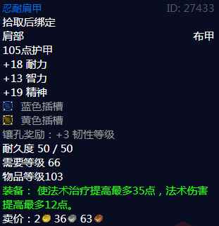 忍耐肩甲属性,拾取后绑定,肩部布甲,105点护甲,+18耐力,+13智力,+19精神,蓝色插槽,黄色插槽,镶孔奖励:+3韧性等级,耐久度50/50,需要等级66,物品等级103,装备:使法术治疗提高最多35点,法术伤害提高最多12点。 |