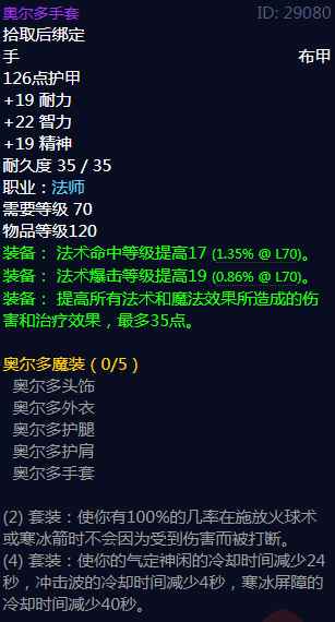 魔兽世界奥尔多手套属性,拾取后绑定,手布甲,126点护甲,+19耐力,+22智力,+19精神,耐久度35/35,职业:法师,需要等级70,物品等级120,装备:法术命中等级提高17(1.35%@L70)。装备:法术爆击等级提高19(0.86%@L70)。装备:提高所有法术和魔法效果所造成的伤害和治疗效果,最多35点。 魔兽世界14天游戏时间免费领取地址:点击查看