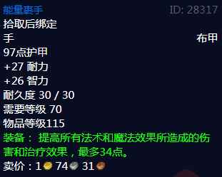 能量裹手属性,拾取后绑定,手布甲,97点护甲,+27耐力,+26智力,耐久度30/30,需要等级70,物品等级115,装备:提高所有法术和魔法效果所造成的伤害和治疗效果,最多34点。 |