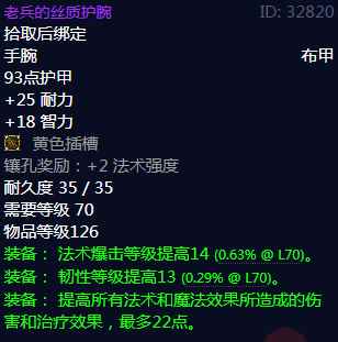 魔兽世界老兵的丝质护腕属性,拾取后绑定,手腕布甲,93点护甲,+25耐力,+18智力,黄色插槽,镶孔奖励:+2法术强度,耐久度35/35,需要等级70,物品等级126,装备:法术爆击等级提高14(0.63%@L70)。装备:韧性等级提高13(0.29%@L70)。装备:提高所有法术和魔法效果所造成的伤害和治疗效果,最多22点。 魔兽世界14天游戏时间免费领取地址:点击查看