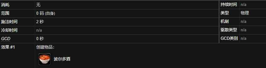 获取方法:通过创建获得 2秒施法时间 材料: 刺鳃鲑鱼, 波尔多酒, 舒心草 需要等级 65 卖价:37铜币 法术细节: