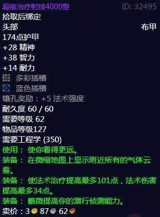魔兽世界超级治疗射线4000型属性,拾取后绑定,头部布甲,174点护甲,+28精神,+38智力,+14耐力,多彩插槽,蓝色插槽,镶孔奖励:+5法术强度,耐久度60/60,需要等级62,物品等级127,需要工程学(350),使用:使你看得更远。装备:在微缩地图上显示附近所有的气体云雾。装备:使法术治疗提高最多101点,法术伤害提高最多34点。装备:略微提高你的潜行侦测能力。 魔兽世界14天游戏时间免费领取地址:点击查看