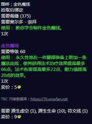 魔兽世界TBC怀旧服中,专业技能的上限提升了,新增了很多配方图纸,比如金色魔线,那么魔兽世界金色魔线图纸哪里刷?下面就给大家带来魔兽世界怀旧服金色魔线配方图纸掉落出处。 魔兽世界14天游戏时间免费领取地址:点击查看 魔兽世界怀旧服金色魔线配方图纸掉落出处 金色魔线配方图纸是在沙塔斯城的奥尔多军需官恩达尔林处购买。