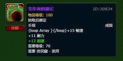 问题: 魔兽世界变形者的徽记属性是什么? 答案: 变形者的徽记 物品等级: 100 拾取后绑定 {loop Array }{/loop}+15 敏捷 +11 耐力 +12 加速 需要等级: 70 需要 贫民窟 - 崇拜