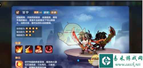 萌将风云里面的甘宁是游戏中一个十分强大的肉盾,给敌人造成伤害的同时还能减少敌人的物理防御力让敌人处于破甲状态,那么萌将风云里面的甘宁究竟怎么样呢?下面小编就给大家介绍一下萌将风云甘宁属性介绍,希望能够帮助到大家。 甘宁属性介绍 甘宁 生存能力:★★★★ 输出能力:★★★ 辅助能力:★★ 技能介绍 1、对面前范围内的敌人造成一次伤害,并造成晕眩。(提升伤害148点,晕眩触发几率随技能等级提升,对1级以下的敌人必然晕眩) 2、对面前范围内的敌人进行三连斩,造成多次伤害。(提升伤害115点) 3、对面前范围内的敌人造成一次伤害,并短时间内降低物理防御。(提升伤害20点,破甲命中几率随技能等级提升,对21级以下敌人必然命中) 4、大幅增加自身力量。(被动:增加力量123点)