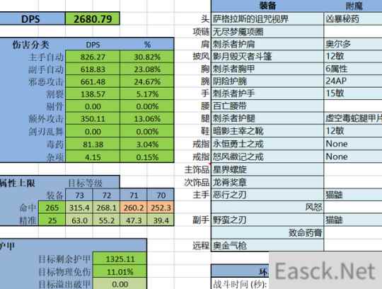 这里使用的工具是Simonize_TBC盗贼数据模拟器,这是一款非常好用的盗贼DPS模拟器,基本可以还原盗贼的输出环境,小探搭配的盗贼P3基础装在满BUFF、单目标环境下输出了4分半,平均秒伤达到了2680点。