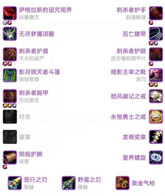 武器选择双剑,在同等武器秒伤的情况下,战斗剑比其他武器要高80点左右的秒伤,刚好T6团本掉落的恶行之刃和野蛮之刃可以凑成一对。 饰品保持不变,背叛者的疯狂的特效覆盖率仅仅只有40%,和龙脊奖章和星界螺旋相比差距太大。背叛者的疯狂还是猎人使用更加合适。