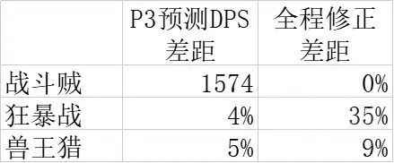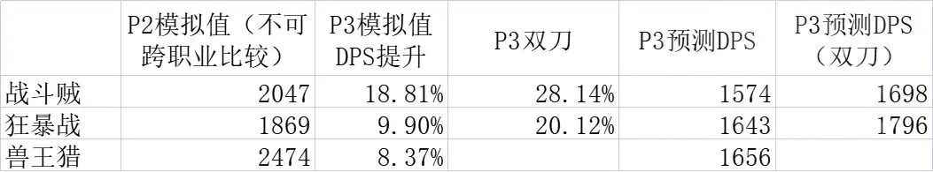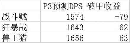 可以看到P2阶段,仅在单体BOSS一栏,战斗贼的DPS差距明显,算上全程DPS,战斗贼与狂暴战兽王猎差距很明显。 二、P3模拟与猜想 缺乏WCL实战数据,故采用模拟器形式,对比盗贼、狂暴战、猎人P3阶段相对于P2阶段的DPS提升情况,制作表格如下(4分钟,7700护甲,常规满BUFF,无强破无鸡无钳子)