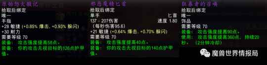 猎人玩家在祖阿曼可以拿到不少新的好装备,我们需要更换的装备包括: 三箱子的[原始怒火徽记] 祖尔金掉落的主动饰品[狂暴者的召唤] 妖术领主玛拉卡斯掉落的[邪恶魔精匕首],这是可以双持的,属性非常强