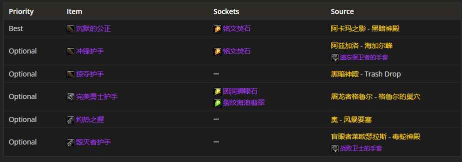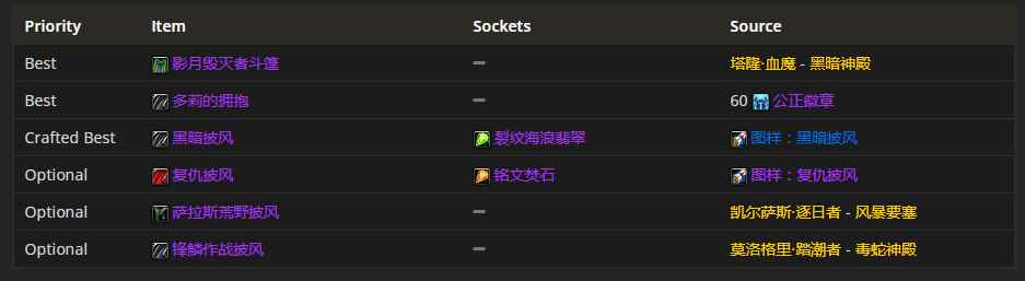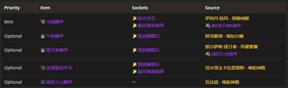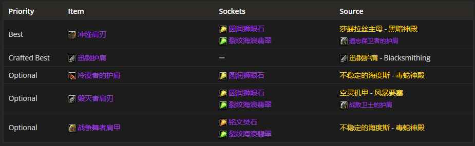 肩部装备首选冲锋肩刃,附魔推荐强力利刃或复仇铭文
