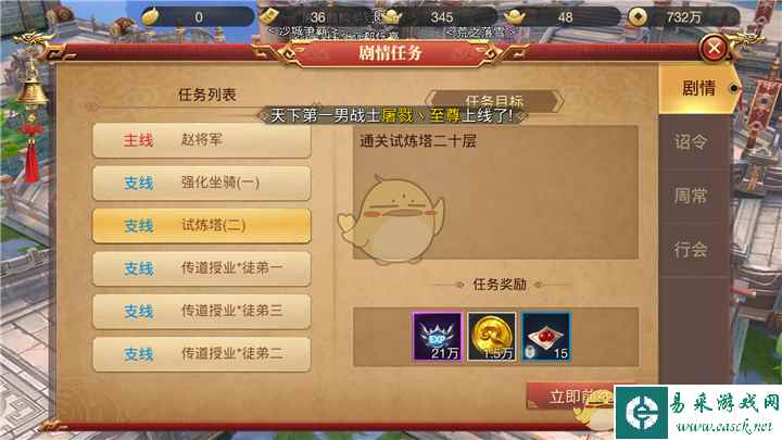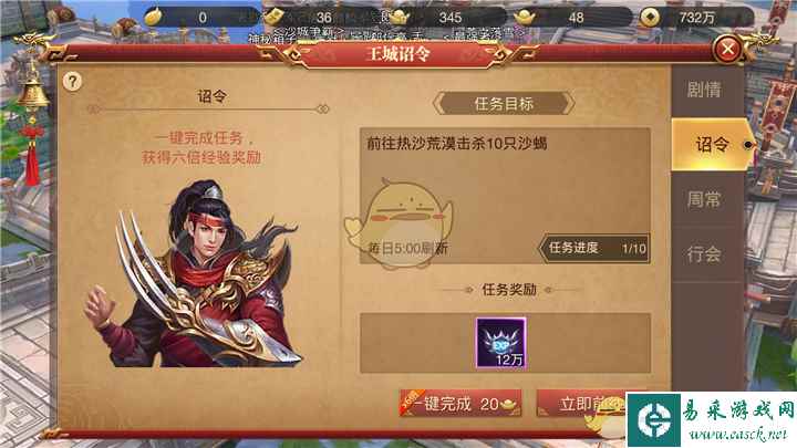 【王城诏令】 王城诏令每日可以完成10次,使用元宝快速完成可以获得多倍经验,不过随着使用元宝完成次数变多,单次立即完成消耗的元宝数量也会越多。