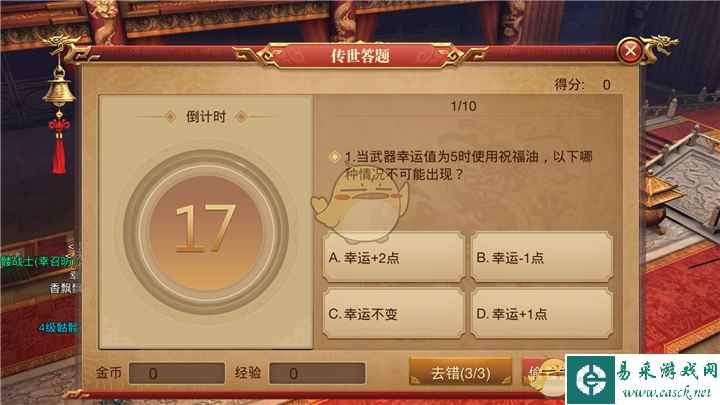 【传世答题】 传世答题活动可以获得大量金币和经验奖励,如果成绩排名够高,还可以获得额外的排名奖励,奖励非常丰厚,奖励中有高级强化材料,如玄铁石等。另外,答错了也有大量经验和金币!只是最后得分排名会比较低。