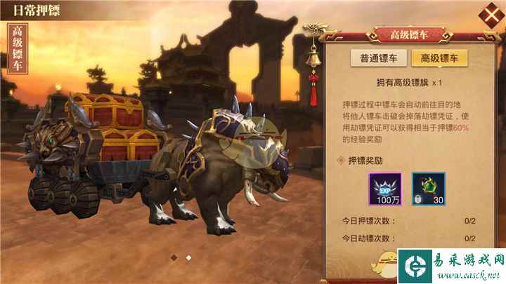 【日常运镖】 开服后,我们会获得大量绑元奖励,当开启运镖功能后,我们使用高级运镖令(40绑元一个),然后运送2次高级镖车,可以获得200万经验。
