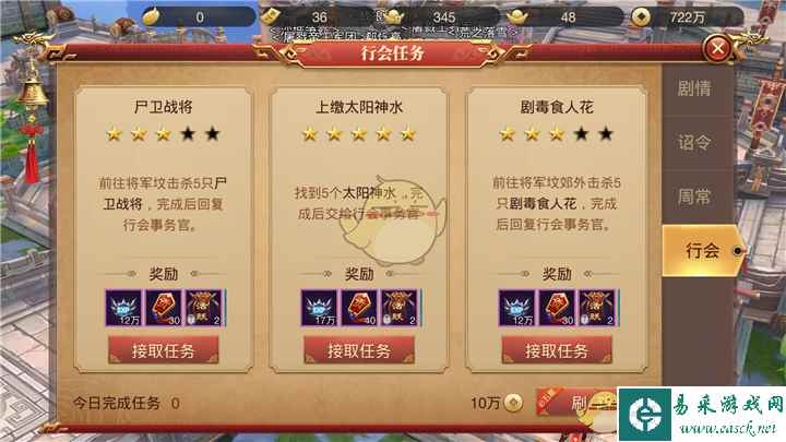 【行会任务】 行会任务必须加入行会后才可以接取,行会任务分为1-5星,5星任务得到的经验最多,每次刷新任务需要消耗10万金币,建议大家只做5星行会任务,因为只要使用金币刷新必出5星任务,不用担心自己运气不好。