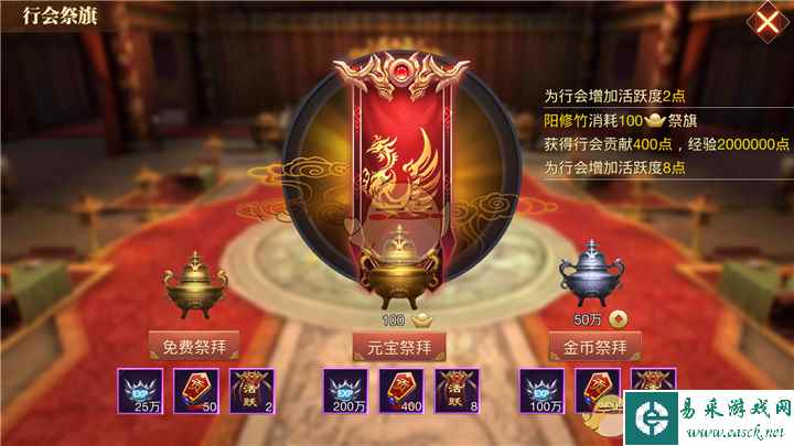 【行会祭旗】 参与行会祭旗活动的前提是已加入行会,行会祭旗可以快速得到巨额经验,我们如果愿意使用元宝祭旗的话,那第一天升级到37级也挺轻松,可以直接去宝地2层打怪了,如果不使用元宝祭旗,那使用金币祭旗和免费祭旗,也可以轻松升至36级,我们每天可祭旗3次(免费祭旗、金币祭旗、元宝祭旗各一次)。