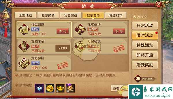 2. 【参加活动赚大财】 《传奇世界3D》手游有着琳琅满目的活动玩法,如死水战场、万魔秘境、首领来袭、荒野狩猎等,不仅有单人玩法,更有组队、行会PK大型活动。每天把感兴趣的活动做一遍,就能赚得盆满钵满。
