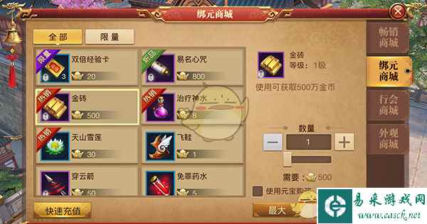 3. 【逛商城获金币】 说道最简单直接的方法,就是直接跟商城购买了,使用买来的金条、金砖,就能获得大量金币!