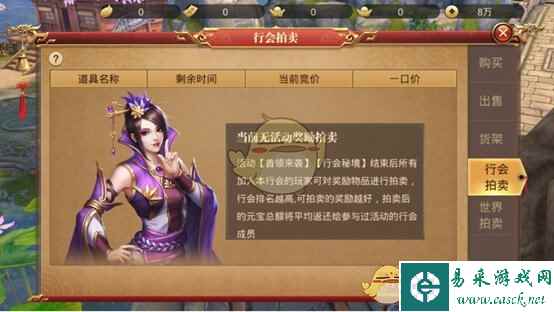 需要加入行会后,根据本行会参与的活动决定行会拍卖行中是否有物品上架; 在行会拍卖行中竞拍物品的元宝将会被平分给参与相应活动的玩家; |