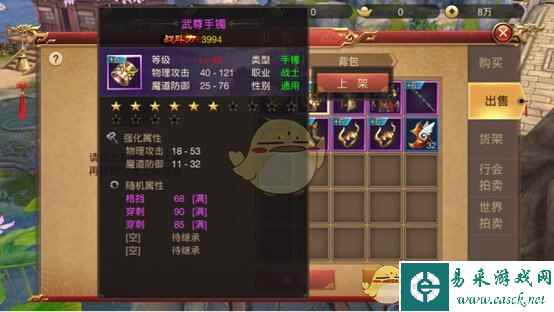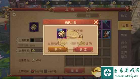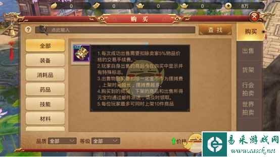 拍卖行规则 1. 每次成功出售需要扣除卖家5%物品价格的交易手续费。 2. 玩家自身出售的商品会在购买中显示并有特殊标志。 3. 出售物品需要扣除一定金币作为摆摊费,上架时间越长,摆摊费越多。 4. 购买到的商品,下架的商品和出售所得元宝均通过邮件发送,请及时领取。 5. 每位玩家最多可同时上架10件商品。