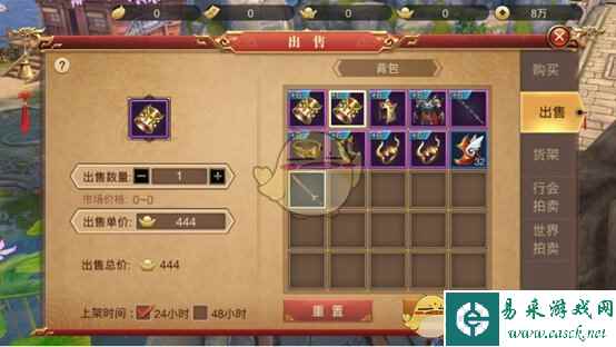 选中出售页签,可选择自己想要出售的物品,点击后选择上架