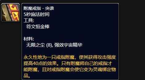 附魔专业到了80级特色依旧是戒指附魔,不过戒指附魔在80级有了更多选择,附魔耐力可以提高30点(2戒指60点耐力),附魔法伤提高23点(2戒指46点法伤),附魔突袭提高40点攻强(2戒指80点攻强)。综合来讲,附魔没有任何限制,各个职业都可以学习附魔专业。
