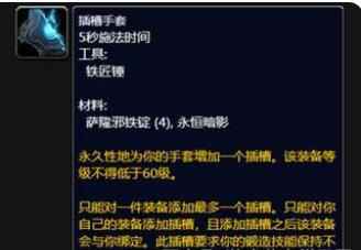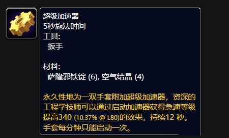 工程学专业在80级除了可以制作机械路霸坐骑以外,还可以制作超级加速器,这是所有输出职业必备的一种附魔,是手套附魔,效果是有几率提高340点急速等级,持续12秒。