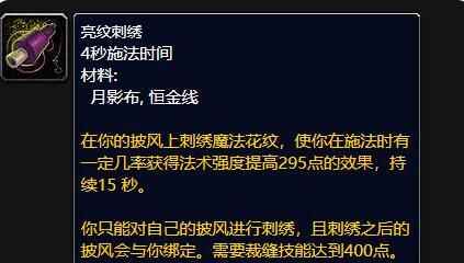 裁缝专业到了80级是很多玩家愿意学的专业,一是裁缝可以制作飞毯坐骑,另外裁缝可以制作自己专属的附魔一一亮纹刺绣。亮纹刺绣是披风附魔,效果是施法时有一定几率获得295点法伤,持续15秒。同样是团本开荒的神器,法系职业不可缺少的附魔之一。